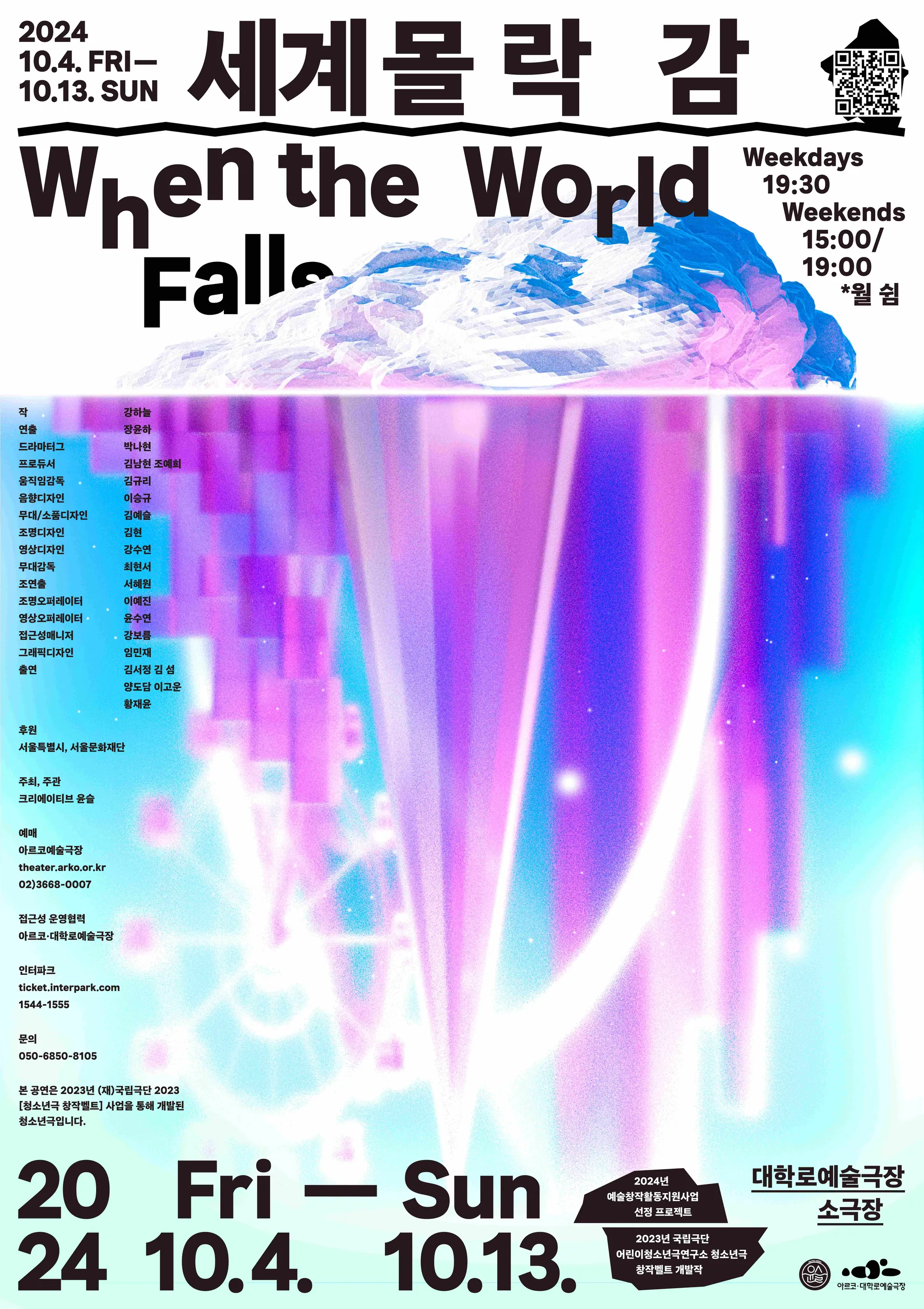 작품 개발 과정에서 청소년들과의 워크숍을 통해 주목한 청소년만의 특별한 시각과 경험을 바탕으로 개발된 이 작품은, 2023년 국립극단 어린이청소년극연구소 [청소년극 창작벨트] 낭독공연에 이어 2024년 10월 대학로예술극장 소극장에서 무너지는 세계를 살아가는 지금의 청소년과 그 시기를 지나온 어른 모두와 연결되고자 한다.
